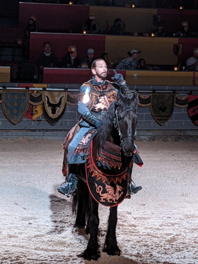 Our Trailer Park Neighbors Randy and Jen, Dennis and I got Tickets to Medieval Times. Wow what a show and Dennis could not have picked the seats any better not only we were center, We were on the Black and White Winning team! Our Knight beat all others! We Each had a 1/2 chicken and potato, soup, roll and Dessert. All eaten with our hands "Medieval Style". The show was wonderful and the horses were so well trained. Great time.
