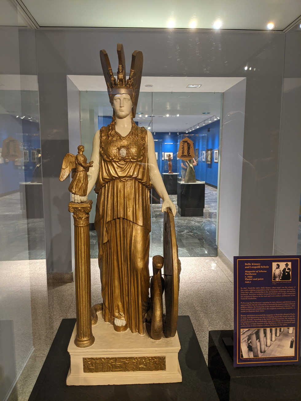 The City of Nashville undertook the construction of a full-scale replica of the Parthenon the the 1897 TN Centennial Exposition. Made with Brick, wood lath, and plaster was to be just temporary but after the Centennial People wanted it to stay so they started reconstruction, a tornado took the roof off and construction was delayed. Athena-Goddess of wisdom stands 41'10". Nike-goddess of victory is 6"4" in Athena's hand.